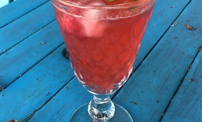 So just muddle the raspberries and mint leaves in the glass, then add the gin, elderflower and rose cordial, and then top up with sparkling water.