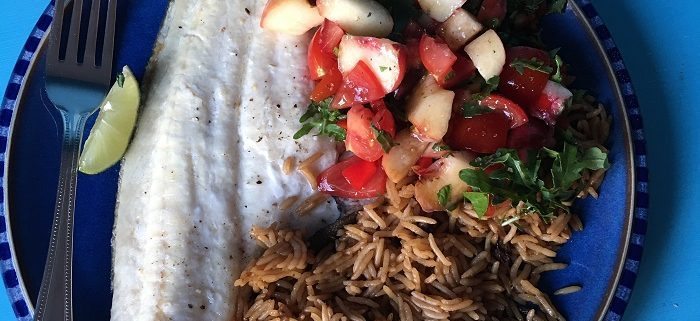 Last night, we had a simple plaice fillet (above) grilled with butter and pepper, and served with some easy mushroom rice (plain, boiled basmati, stirred through with some sliced mushrooms that have been pan fried in more butter and pepper!), and a lovely, easy salsa of a few flat peaches that were past their best, some chopped, ripe tomatoes, red onion, red chilli and a handful of whatever herbs are still surviving in the garden.