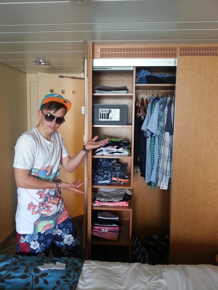 With four of us (and they’re big lads, our two) in one stateroom, we did wonder whether it would be uncomfortably cramped, but luckily the rooms are cleverly designed and there is loads of storage. All our bags and cases fitted underneath our bed and we were able to hang everything up and store everything in the copious amount of drawers and shelves, as my lovely assistant here demonstrates: