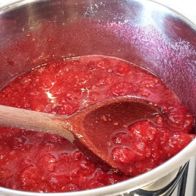 Weigh out the raspberries, then pop them in a large saucepan. Weigh out the sugars so they come to the same weight as the raspberries, then pop that into the saucepan too. Start on a low heat. Stir until the sugar has melted and there’s no gritty feeling at the bottom of the saucepan, then crank up the heat and boil vigorously for about eight to ten minutes. Watch out for boiling hot flying jam lava.